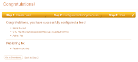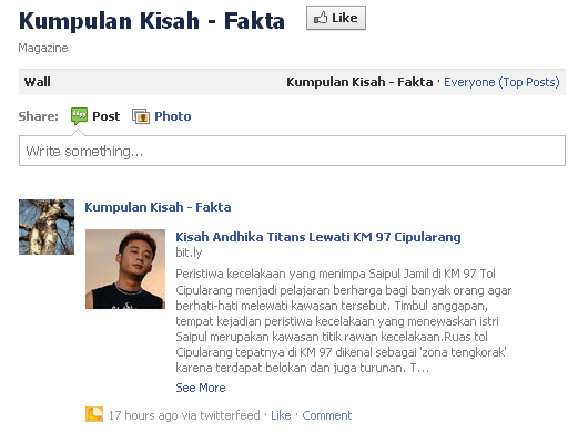 Selain Twitterfeed, bisa juga menggunakan aplikasi dari RSSGrafiti (http://apps.facebook.com/rssgraffiti/) yang pada dasarnya semua fungsinya sama, silahkan di coba dan di pilih pake yang mana untuk bisa updated otomatis postingan di blog ke halaman facebook, baik fanpage, group maupun wall timeline